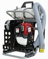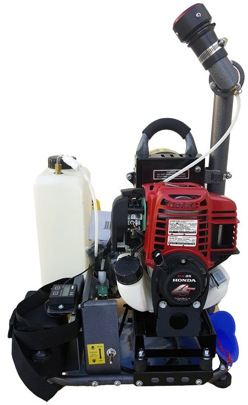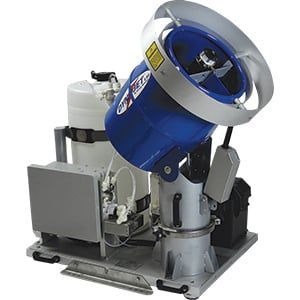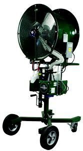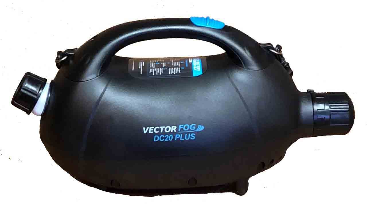 Cold Foggers or Ultra low Volume (ULV) foggers provide a cold fog with particle sizes in the 5-20 micron range. Cold foggers use air pressure to atomize the insecticide and are powered by gasoline, compressed air, or electricity. The lack of heat (and thus the fire risk) makes the ULV fogger safer for indoor use. Both thermal foggers and ULV or cold foggers may be used inside or outside and both can fog water or oil-based products. Sanitizers, disinfectants, mold, and fungi control products are most often applied by cold foggers which allow adjustment of the particle size and provide larger particles used for these applications. Research data indicate ULV fog is best for indoor control of stored product insects (beetles, moths, etc.). The optimum particle size theory plays an important role in the use of ULV fogging equipment for insect control. Droplets of pesticide found to be most effective are those with a small size range allowing them to remain airborne for a considerable length of time and to be carried to the insect by atmospheric transport. Once a droplet reaches an insect, a final requirement is that it impinge (stick) on the insect. Research data indicate that droplets of 5-15 microns (1 micron = 1/25,000 inch) size range best meet those criteria. Larger droplets settle out of the air too rapidly and penetrate cracks and crevices poorly. Smaller droplets tend to deflect around the target insect rather than hitting and impinging on it. Most ULV equipment produce particles in this size range. Large, portable ULV foggers are available for use on ATV’s and other vehicles for fogging large warehouses or outdoor areas. For inside application of large areas, ULV foggers may be permanently installed overhead, thus eliminating the need to transport the fogger throughout the facility. With automatic, overhead, permanently installed, ULV systems, large facilities can be fogged in a short period of time without labor cost.